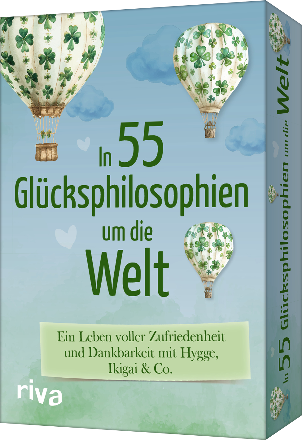 Die Welt hat einiges zu bieten – und zwar nicht nur landschaftlich, sondern auch in Form von wunderbaren Glücksphilosophien, die die Menschen Gelassenheit, Ruhe, positives Denken und Lebensfreude lehren. Dieses liebevoll gestaltete Kartenset vereint 55 dieser Weisheiten, darunter beispielsweise die dänische Hygge-Gemütlichkeit sowie die japanische Ikigai-Erfüllung. Jede Karte bietet neben der Beschreibung einer Philosophie praktische Impulse, wie diese ins Leben eingebunden werden kann. Ob Übungen, Rituale, Perspektivwechsel oder Gedankenspiele: Mit diesen Glückswegweisern geht es Schritt für Schritt in ein Leben voller Zufriedenheit!